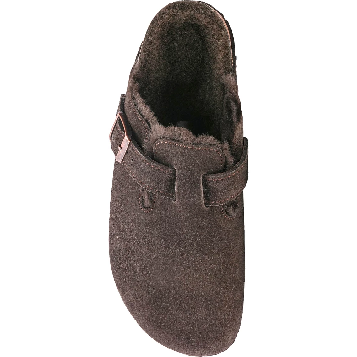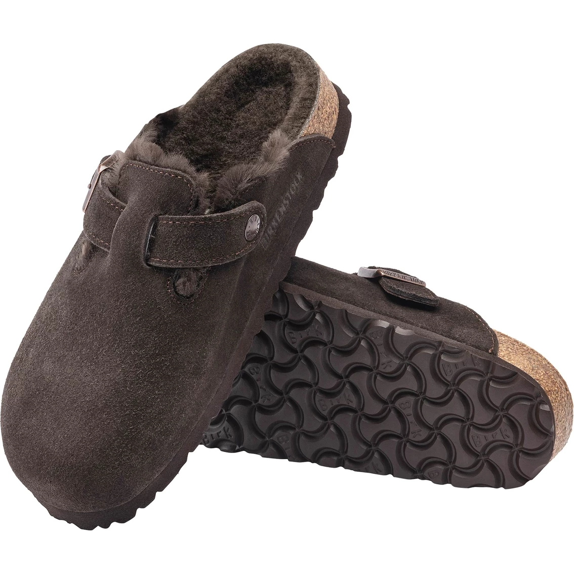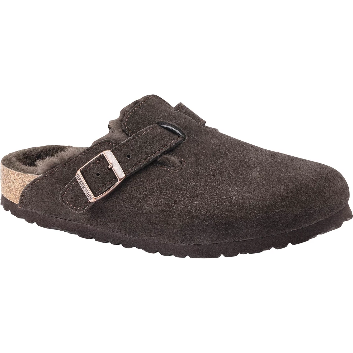 These Boston Mocha Suede Clogs with Shearling feature the Birkenstock look and feel with contour footbed The signature slip-on clog from Birkenstock — the Boston. A casual-wear staple that is perfect all year round with a simple, adjustable design and contoured cork footbed that forms to the shape of your foot. Here, the classic model comes in a particularly cozy version with color-coordinated shearling lining. The perfect shoe for cozy winter evenings! The upper is made from soft suede.