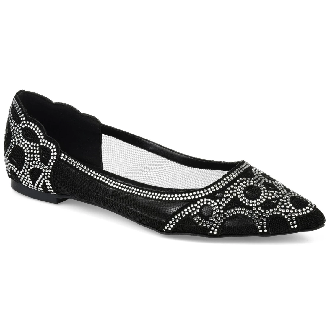 The class of a heel with the comfort of a ballet flat. The Bataiva by Journee Collection is a pointed-toe mesh and vegan leather flat adorned with art-deco-inspired rhinestone accents. A wide-width footbed and padded insole complete this luxe yet comfortable style for extra comfort.