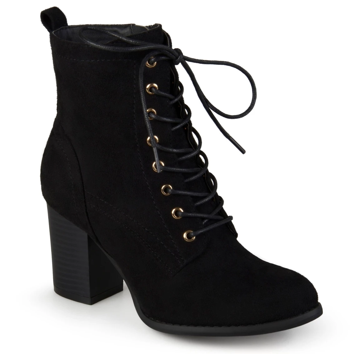 Our take on the military bootie, the Baylor by Journee Collection. This cool style features soft vegan leather uppers that rise above the ankles, accented by a classic lace-up closure. A stacked block heel, wide-width footbed, and padded insole perfect the design.