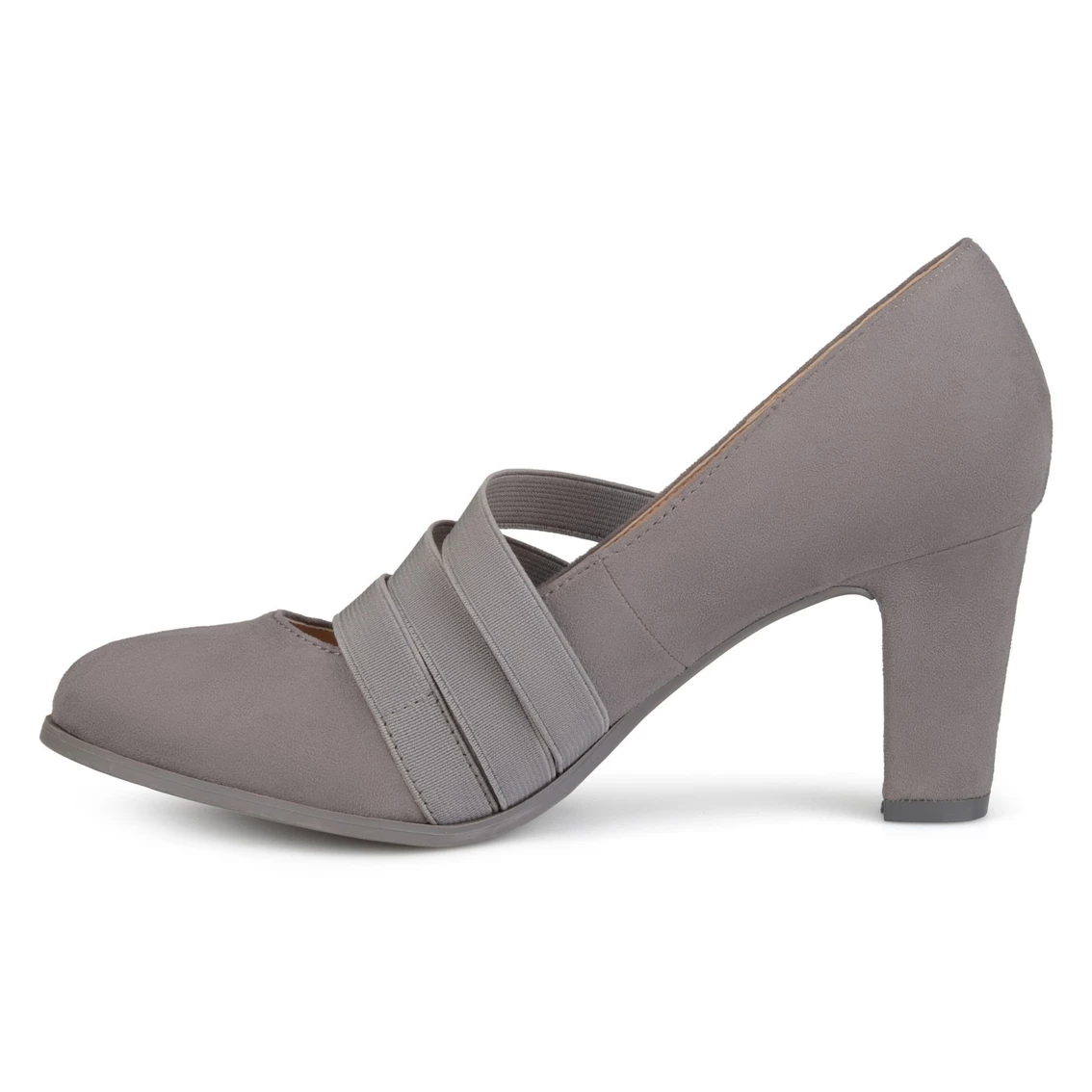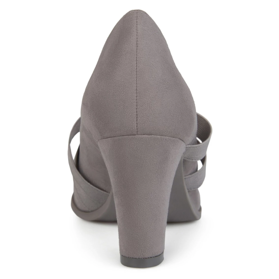 A vintage inspired design is highlighted on the elastic strap pumps by Journee Collection. These pumps have soft faux suede uppers and classic round with a triple elastic strap design on the vamps. Comfort insoles create a comfort-sole footbed style.