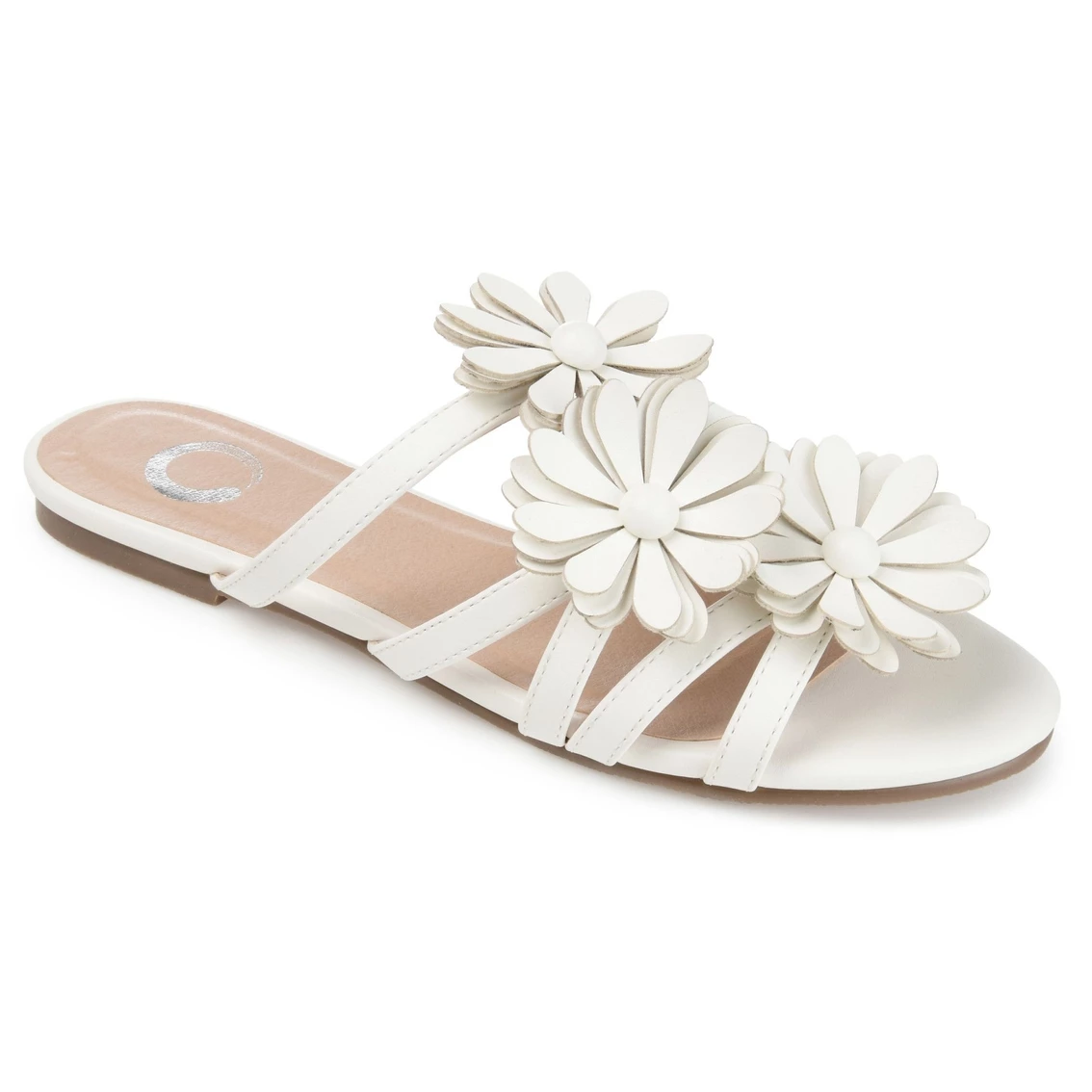 Flourish in the Dolliah sandals by Journee Collection. These strappy slides are adorned with a garden of 3D flowers for a fresh look. Soft vegan leather and covered button details finish this open-toe design.