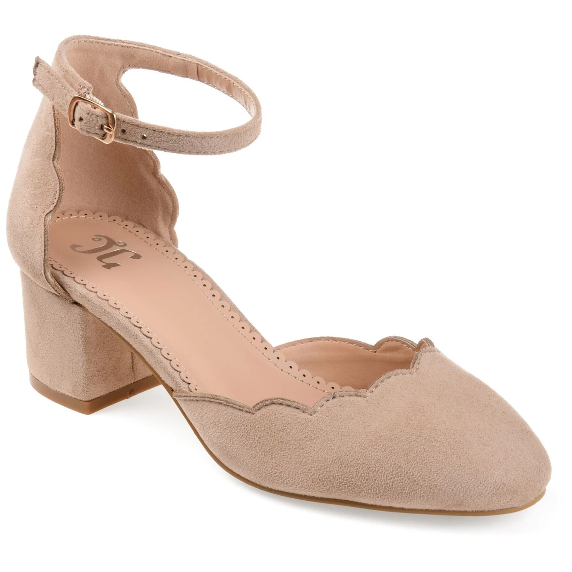 Show off cute style in the scalloped ankle-strap pumps by Journee Collection. These round-toe pumps feature soft faux suede uppers with scalloped edging and a close-cut sole design. Chunky block heels add attractive lift to the style.