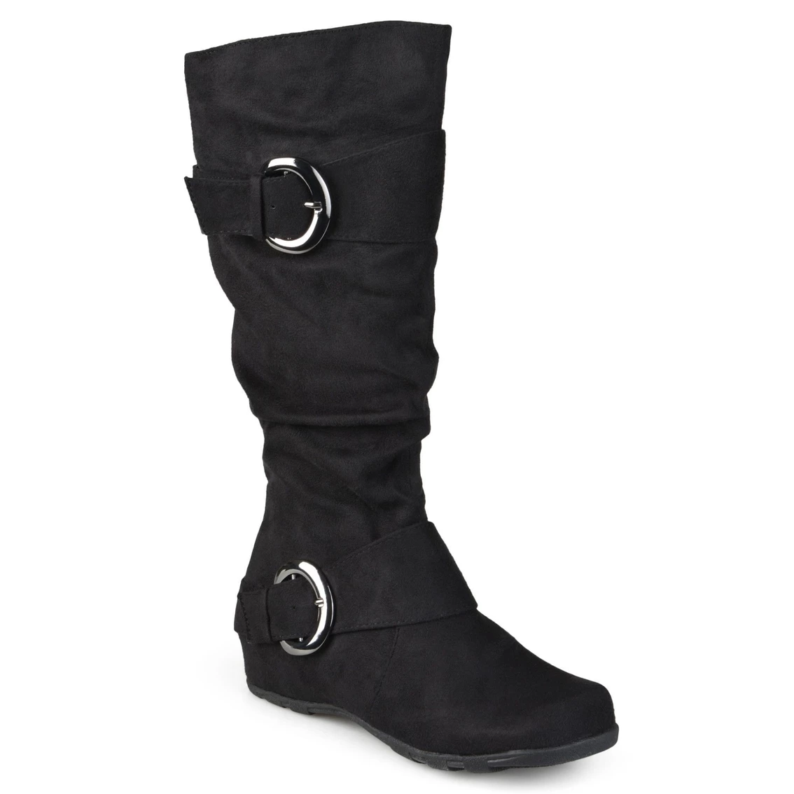 Step into trend-setting style with flat buckle boots by Journee Collection. These winter boots feature smooth faux suede uppers with an extra wide-calf design and subtle slouchy style that rises to a mid-calf height.