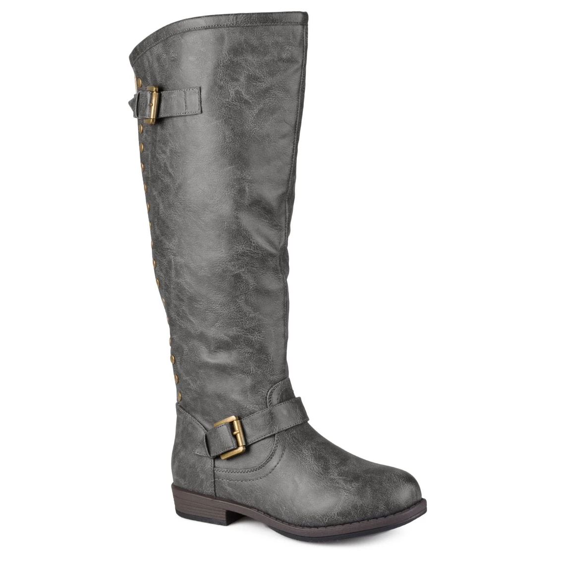 Set the trend this season in studded riding boots by Journee Collection. These chic wide-calf boots feature premium faux leather uppers that are constructed with a roomy design to create an extra wide-calf style.