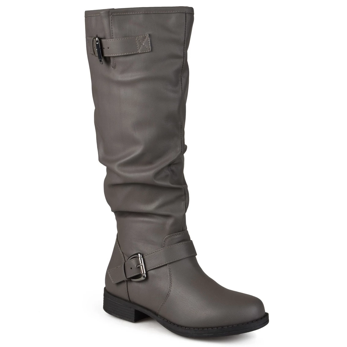 Slip-on the must-have style for the season in extra wide calf slouch riding boots by Journee Collection. Durable faux leather uppers rise below the knees and feature an inside zipper foot entry. A single strap and buckle accent finish the look