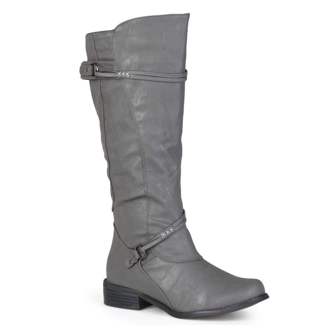 Express your style this season in versatile riding boots by Journee Collection. These boots feature soft faux leather uppers that rise to below the knees with shafts that rise higher in the front. Strappy detail accents the ankles on these fall boots.