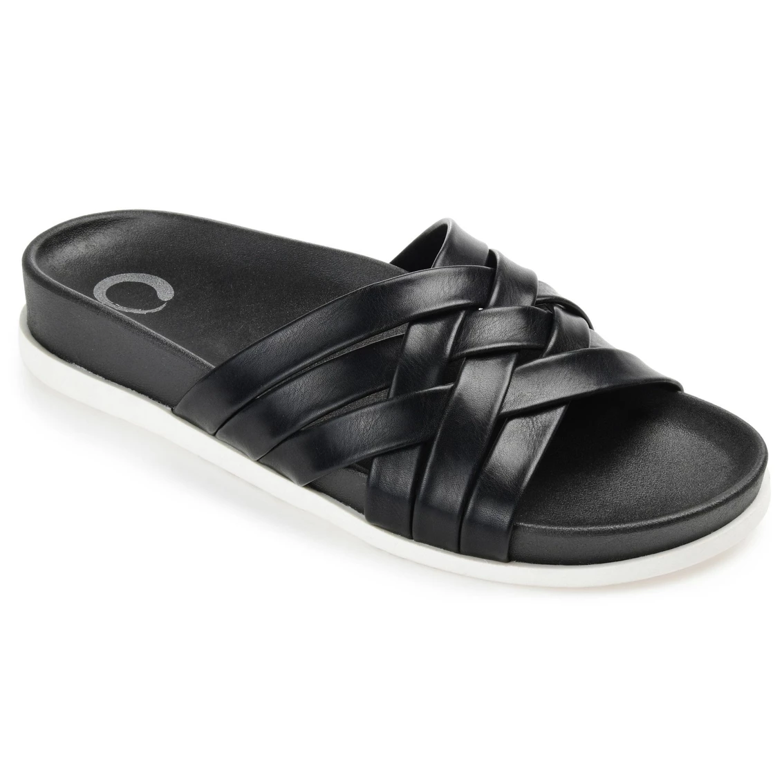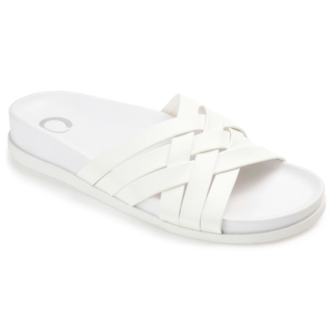 The poolside awaits! The Marina by Journee Collection is the perfect slide for loungy days in your favorite beach chair with a formed footbed and thick man-made sole. Vegan leather straps top this colorful sandal, and a crisscross design perfects the look.