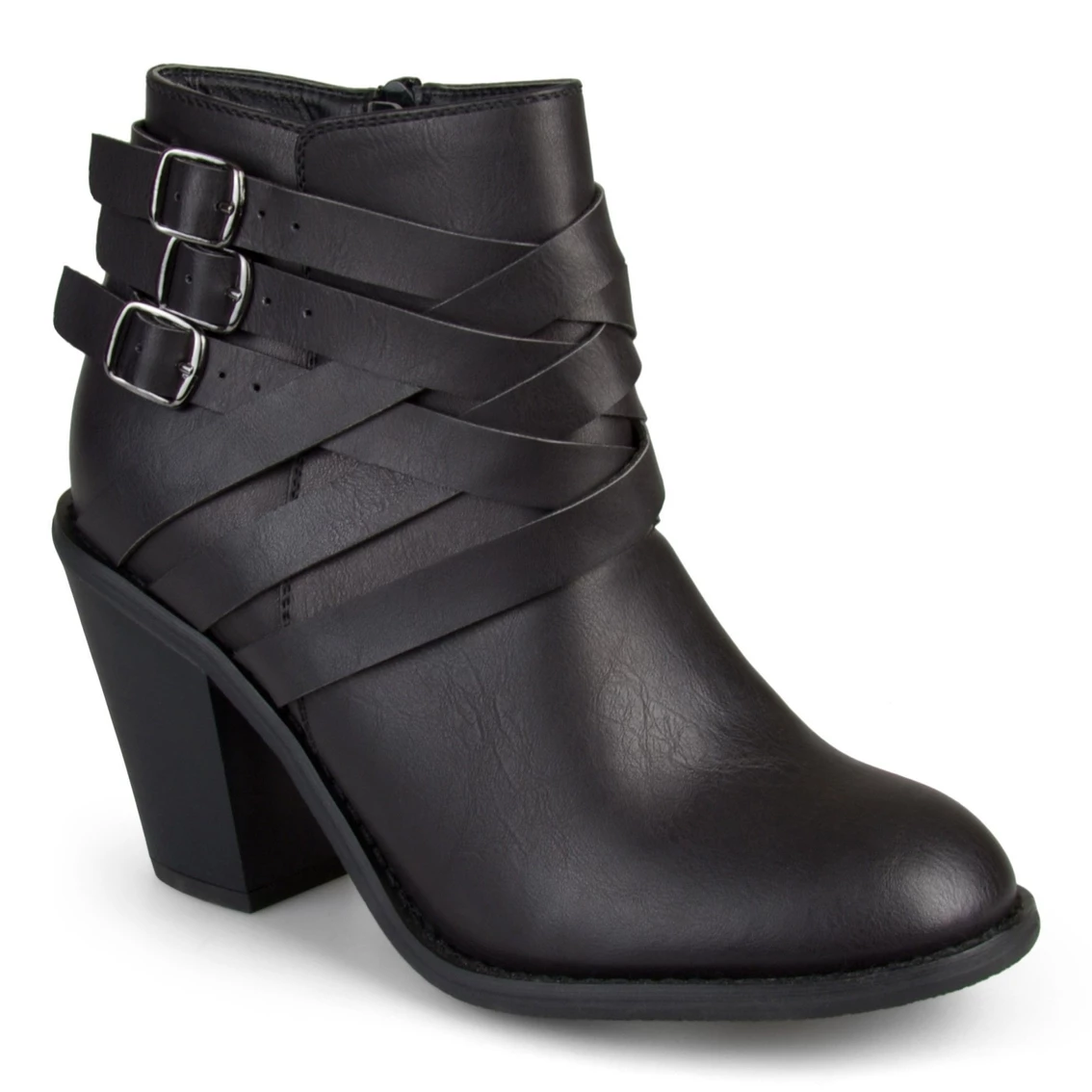 Look chic from your head to your feet in ankle booties from Journee Collection. These stylish booties feature premium faux leather uppers and a stylish strappy design with buckle accents around the ankles. Stacked heels complete the look.