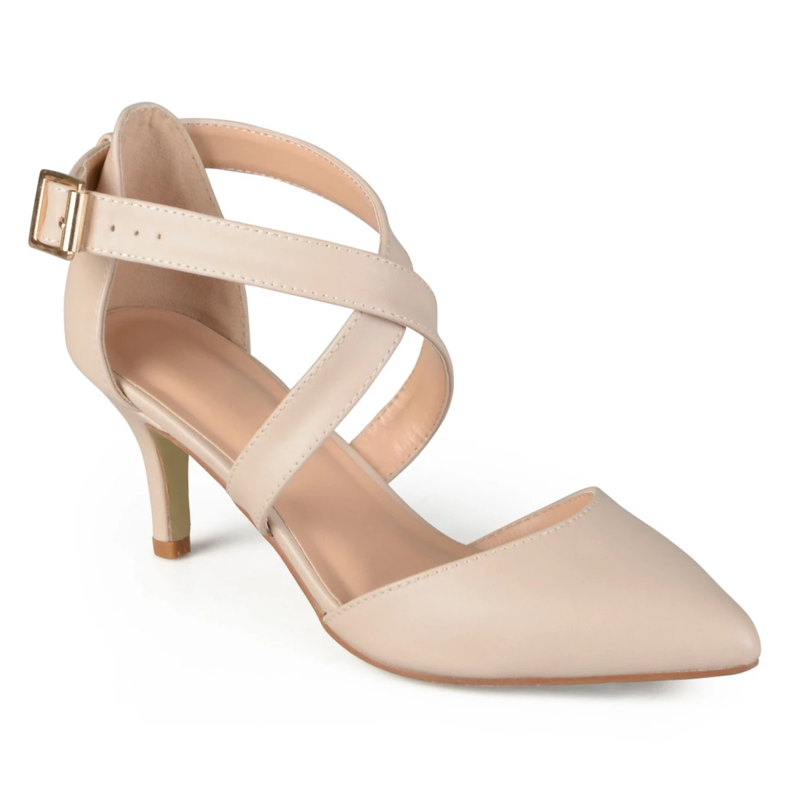 The Riva pump by Journee Collection is comfortable enough for work but dressy enough for a night out. This pointed-toe heel features a wide-width footbed and a walkable, low heel for a comfortable fit. A crisscross strap and buckled closure shape this vegan leather silhouette.