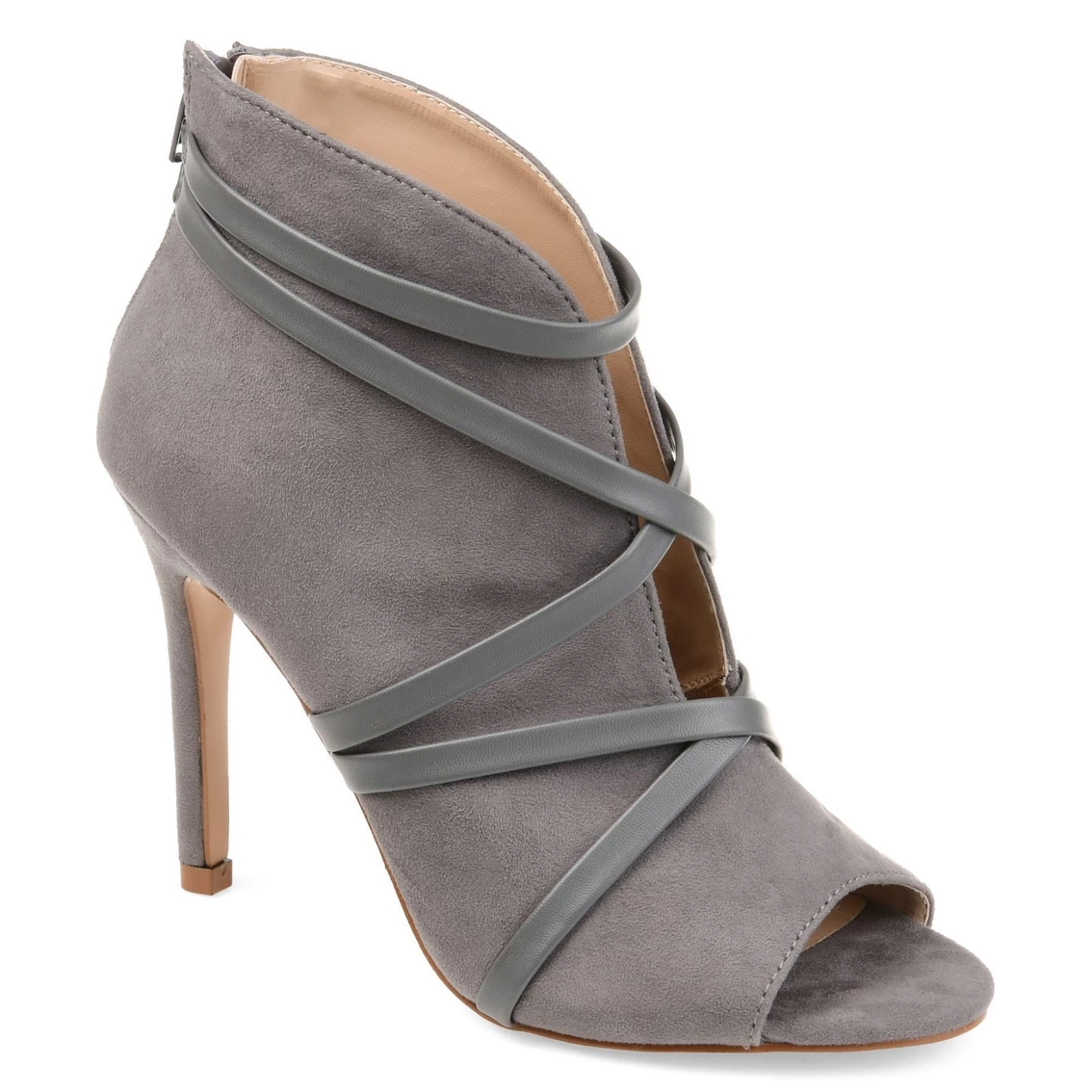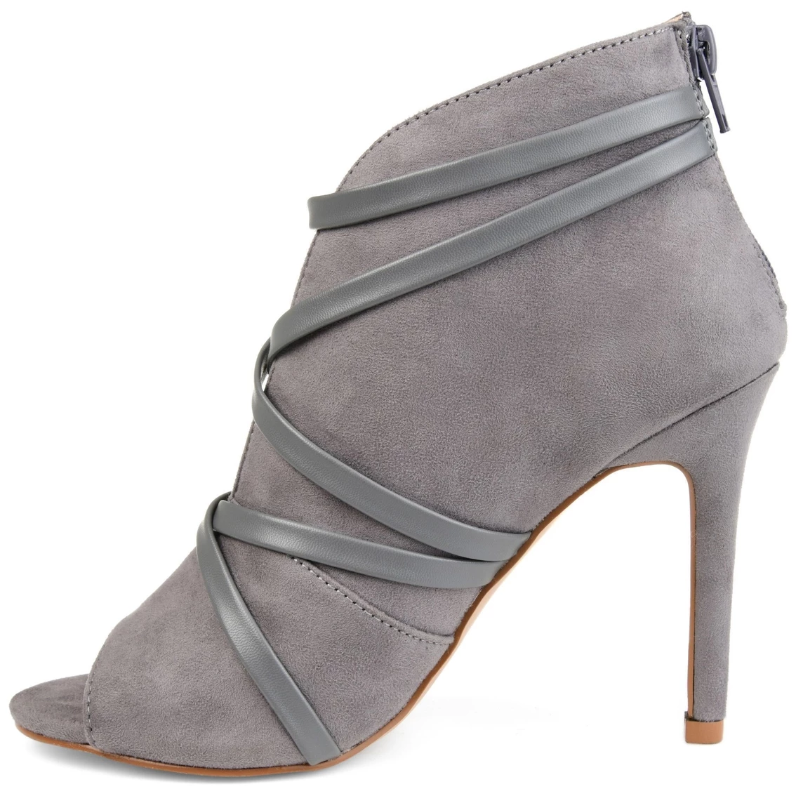 Step into chic style with the open toe bootie by Journee Collection. These shoes feature a soft faux leather design with asymmetrical straps gliding down the shoe. The deep open slit and stiletto heel add gorgeous detail to finish the design.