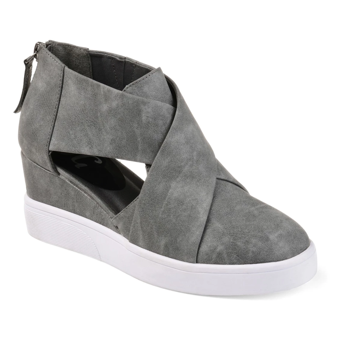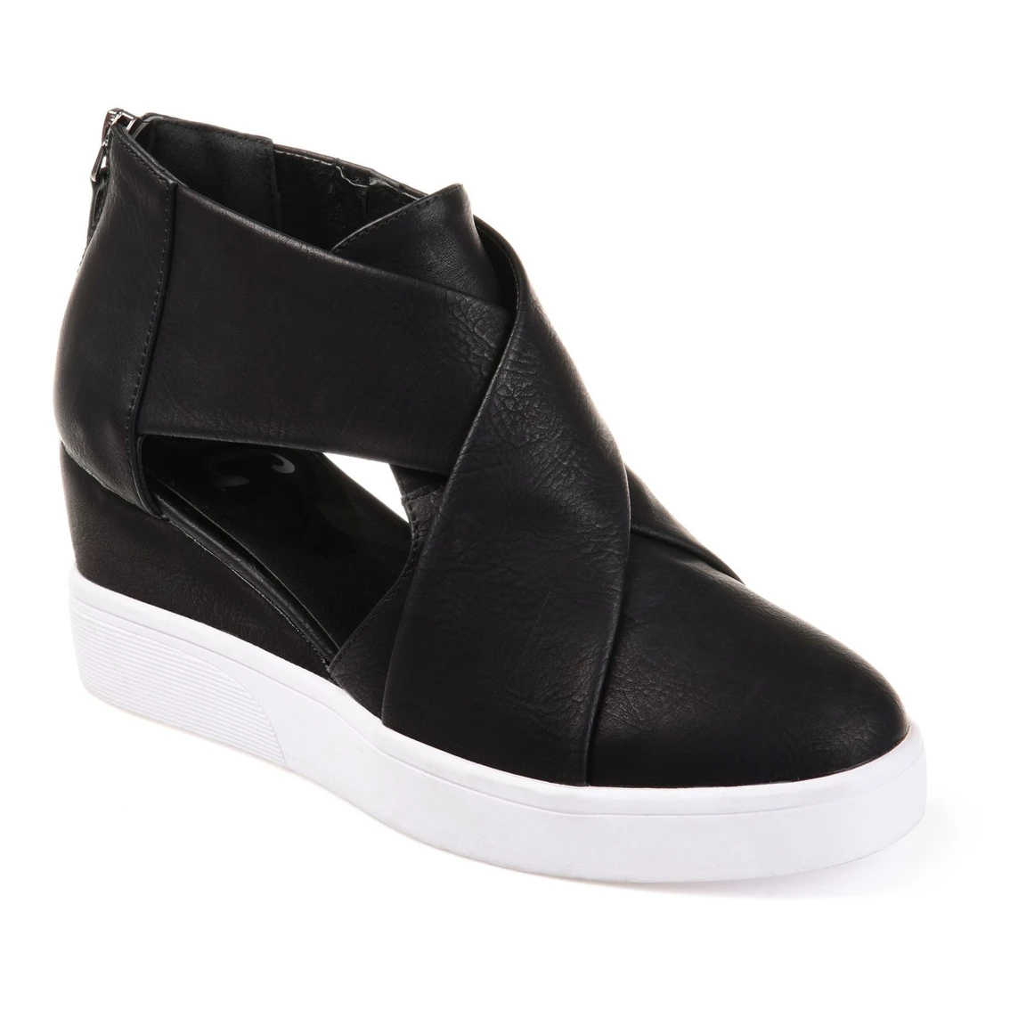 Look effortlessly cool in fashion sneakers from Journee Collection. Soft faux leather uppers display a crisscross design on the vamps and stylish D’Orsay cut-outs at the sides. Thick outsoles and wedge heels create stylish lift to finish the look