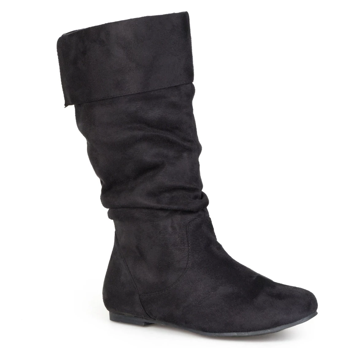 Add versatile footwear to your style this season in flat boots by Journee Collection. These winter boots feature premium faux suede uppers with slouchy style that highlight a fold-over design at the top of the shafts