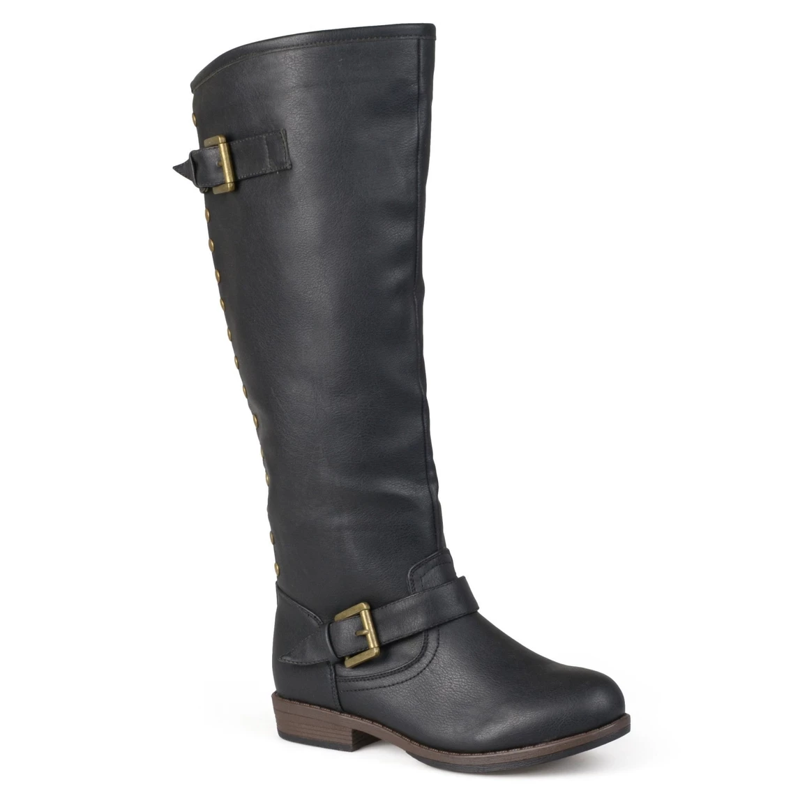 Set the trend this season in studded riding boots by Journee Collection. These chic boots feature premium faux leather uppers that rise to a knee height and feature a back zipper with stud detail. This boot is also available in a wide-calf boot style.