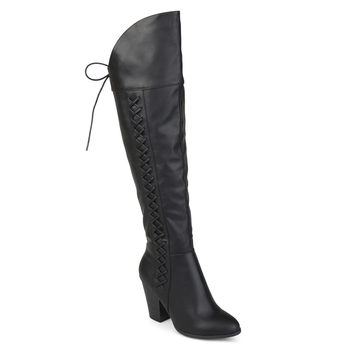 These trend-setting knee boots by Journee Collection are made with premium faux leather uppers, with a raised vamp that covers the knee, and lace detail on the side and back. Faux woodgrain outsoles and block heels provide style to complete the design.