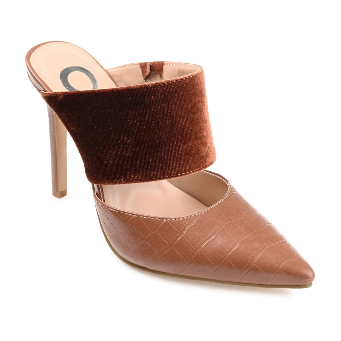 You can slip-on show-stopping style in an instant with the Sutonn heels by Journee Collection. This effortless but chic mule features a towering stiletto heel and a padded insole for comfortable height. Croc textured vegan leather complemented by a velvet strap top this pointed-toe silhouette.