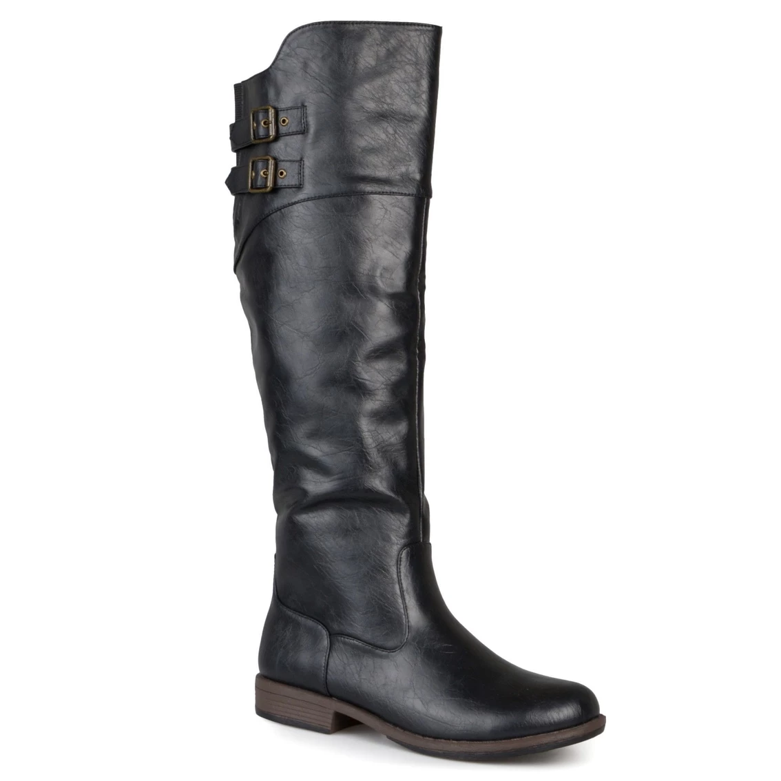 Take on the season in the chicest riding boots this year by Journee Collection. These knee-high boots highlight premium uppers that rise to the knees. Contrasting outsoles and double strap detail with buckle accents completes the look.