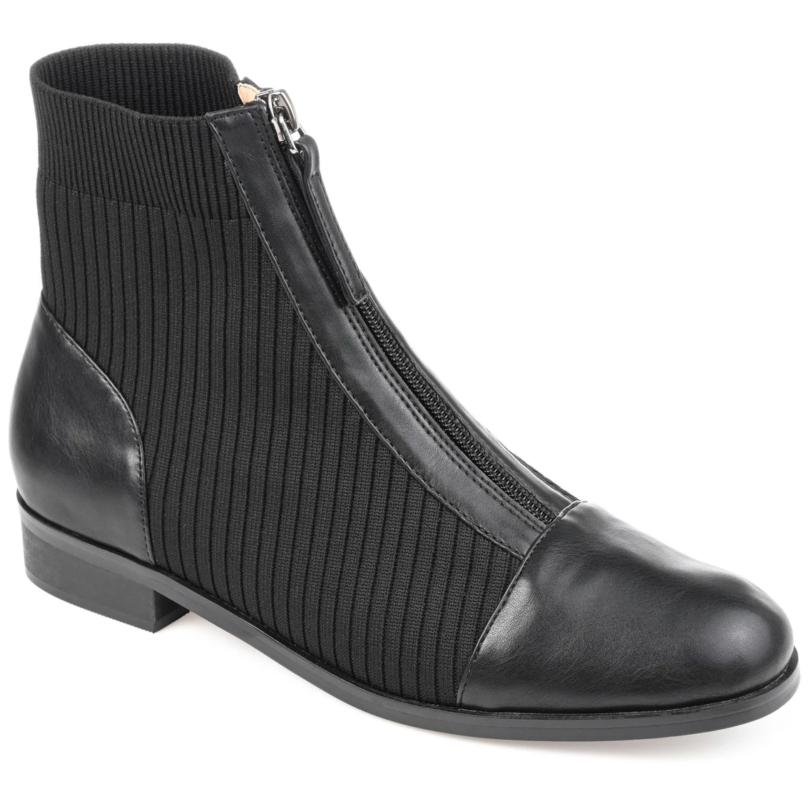 With a zipper at the front and a cap toe, the Bexlie booties by Journee Collection speak for themselves. Shaped with sock knit fabric and vegan leather accents, this retro-style strikes all the right notes. A super comfy 4 mm Tru Comfort Foamβ’ footbed and a tiny block heel ground the look.