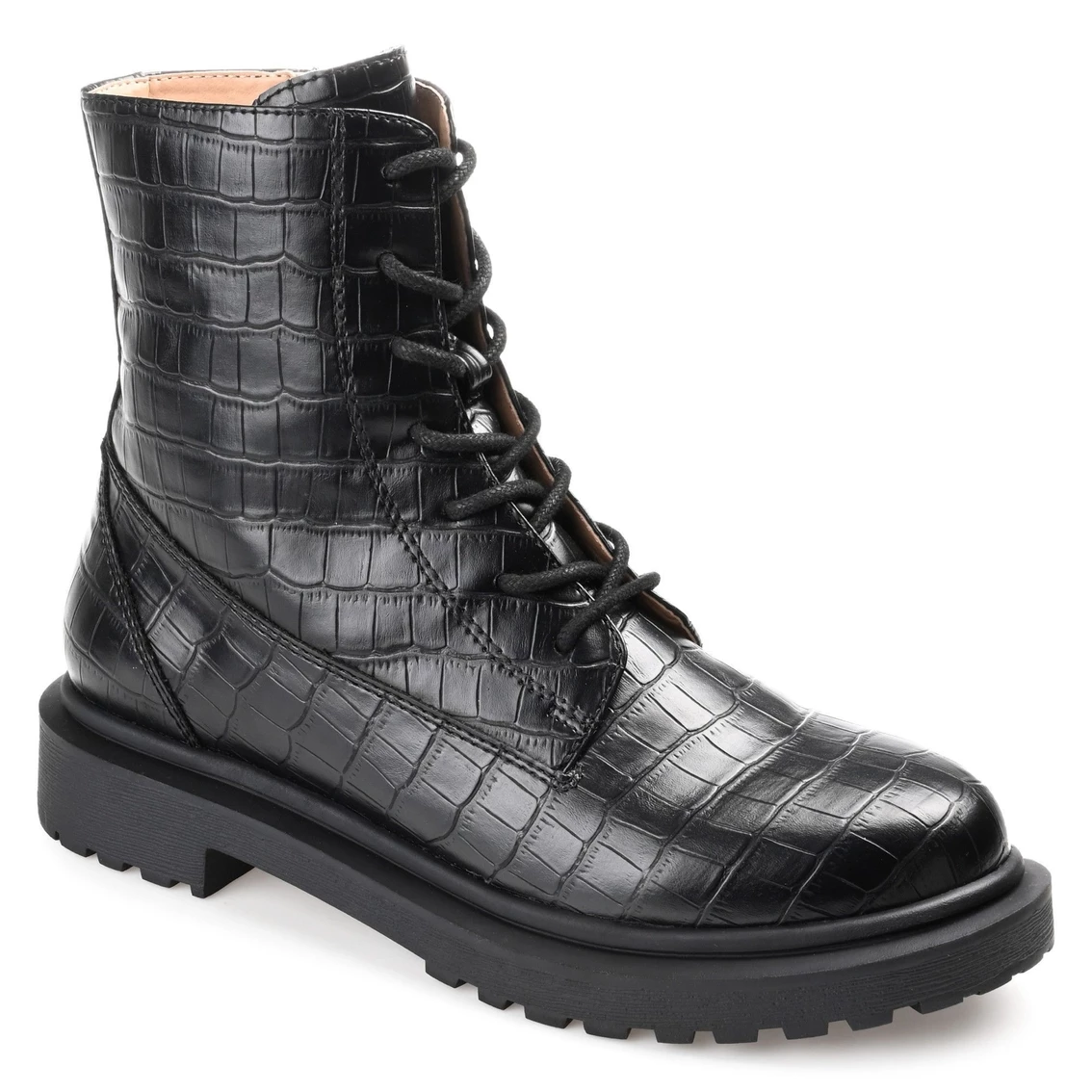 The military bootie with a feminine twist, the Chandlerr by Journee Collection. This throwback design is rendered with croc textured vegan leather uppers and detailed with a classic lace-up design. A block heel paired with a 4 mm Tru Comfort Foamβ’ insole creates a comfortable lift, and a classic round toe finishes the look.