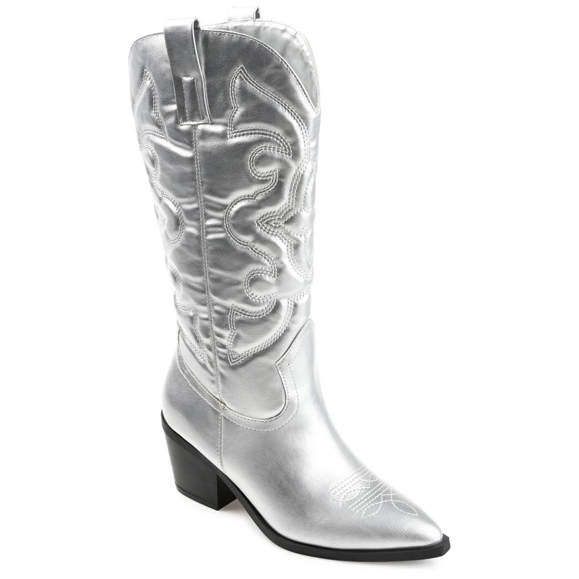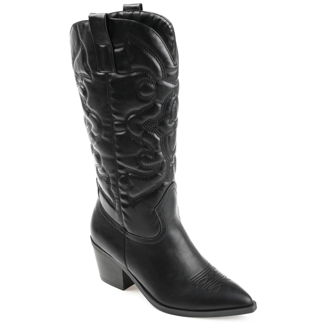 A classic cowgirl bootie reimagined for the modern fashionista, the Chantry by Journee Collection. This pointed-toe boot with western stitch details and soft vegan leather is the most stylish way to embrace your country roots. A block heel and a 4 mm Tru Comfort Foam™ footbed add comfortable height to this mid-calf design.