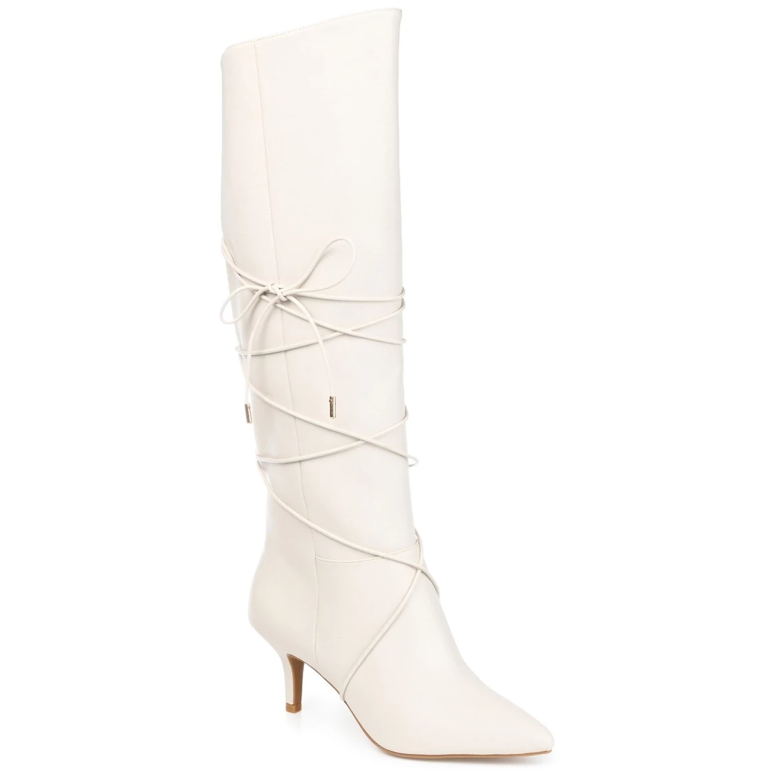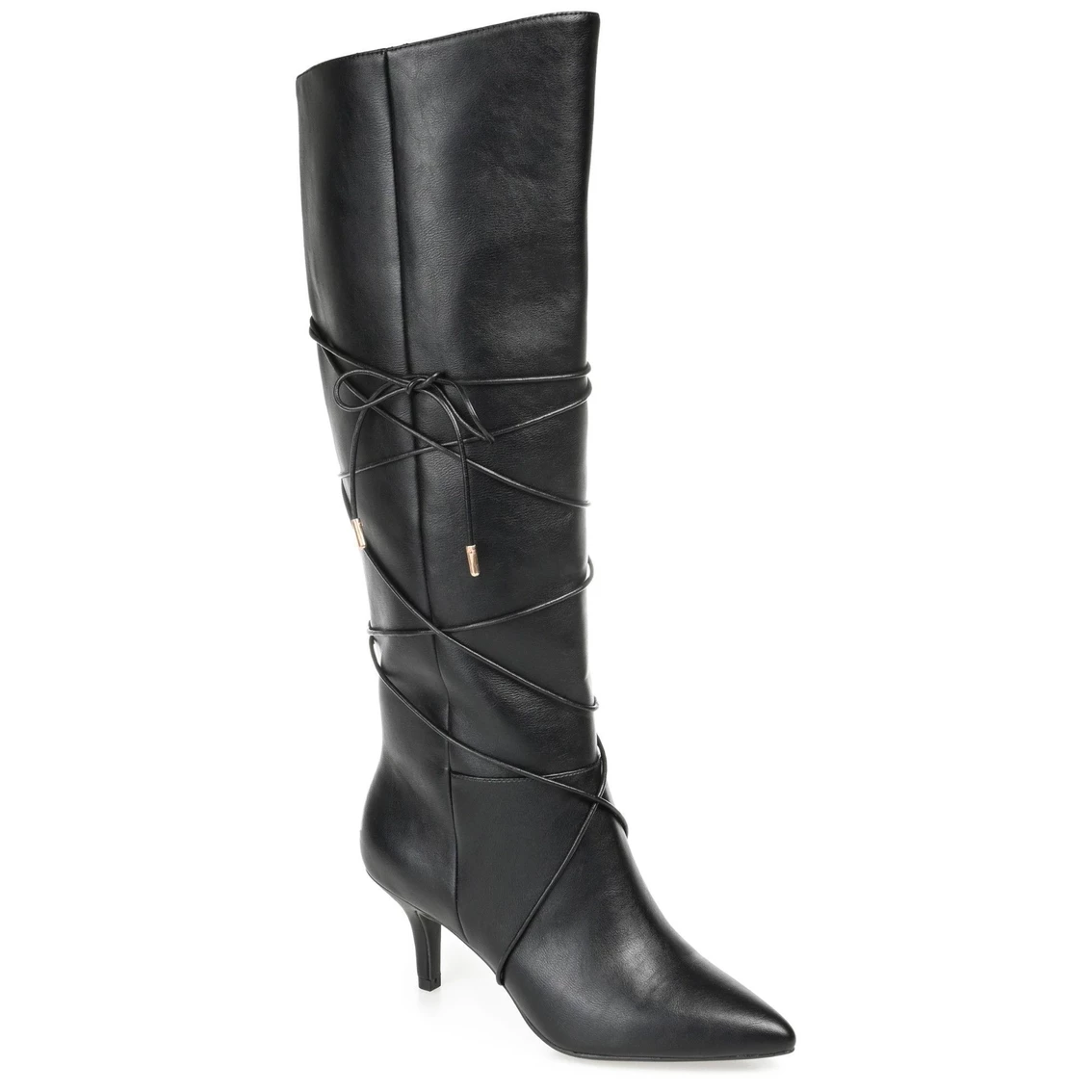 The Kaavia boots by Journee Collection are undeniable proof that kitten heels and pointed-toes have always been a stylish combination. This knee-high boot will add a chic finish to any look with its pointed-toe and wrap-around strap detail. Soft vegan leather and a supportive 4 mm Tru Comfort Foamβ’ insole finish this extra-wide calf style.