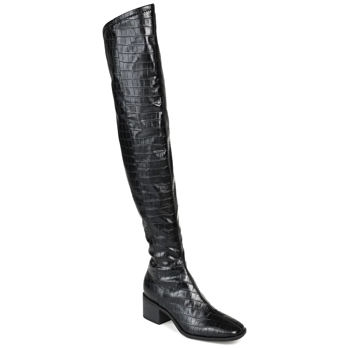 A daring style borrowed from the 90s, the Mariana thigh-high boot by Journee Collection. This extra-wide calf design offers all-day comfort with a 4 mm Tru Comfort Foamβ’ footbed and stretchy vegan leather uppers. A low block heel finishes the design for a subtle lift.