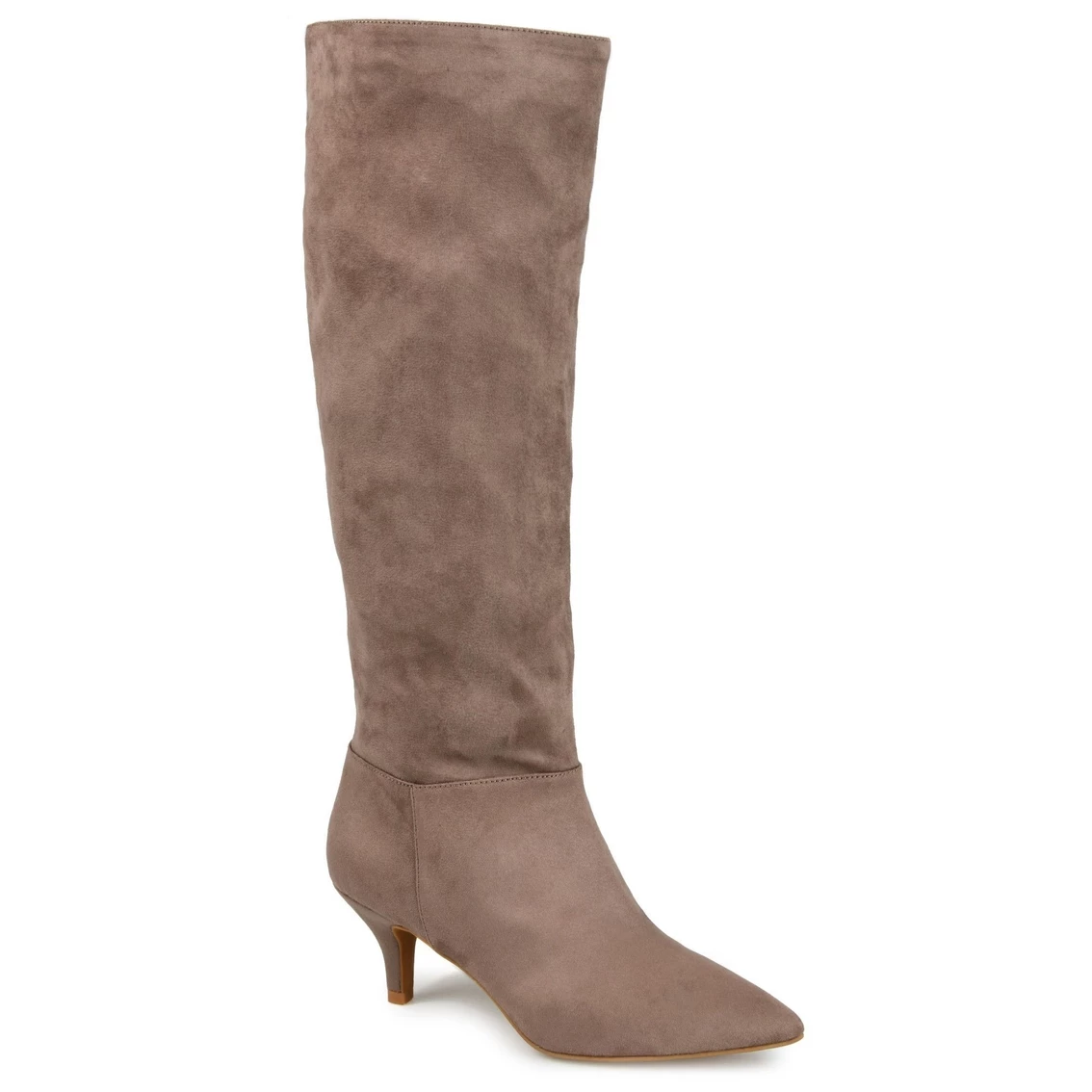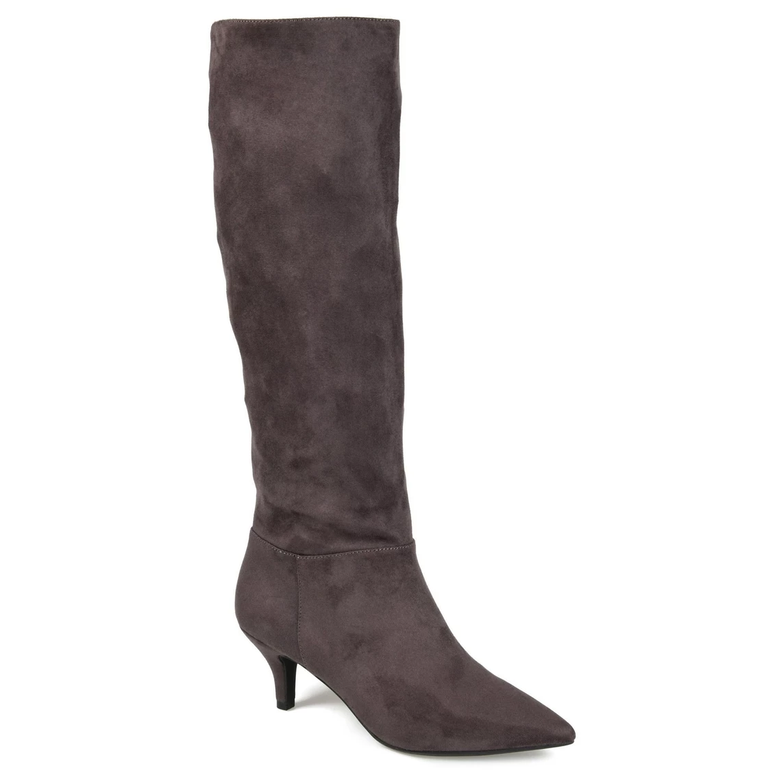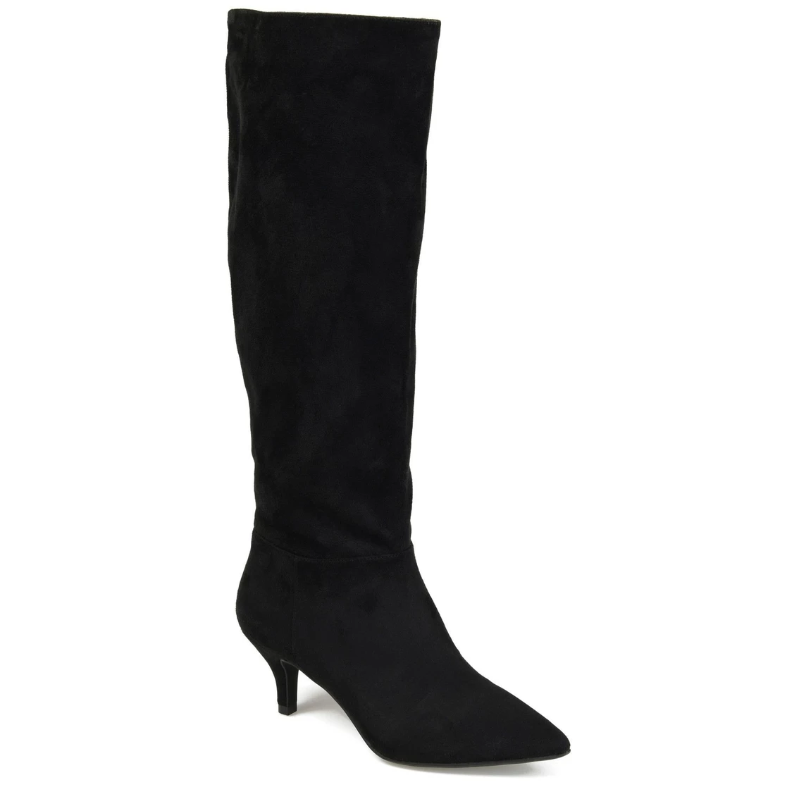 Step up your style this season with this pull-on boot by Journee Collection. The Vellia is a gorgeous vegan leather knee-high boot that sits on a kitten heel for a perfect minimalistic look. This slouchy design features a 4 mm Tru Comfort Foamβ’ footbed and an extra-wide calf, that makes them a breeze to wear all day.