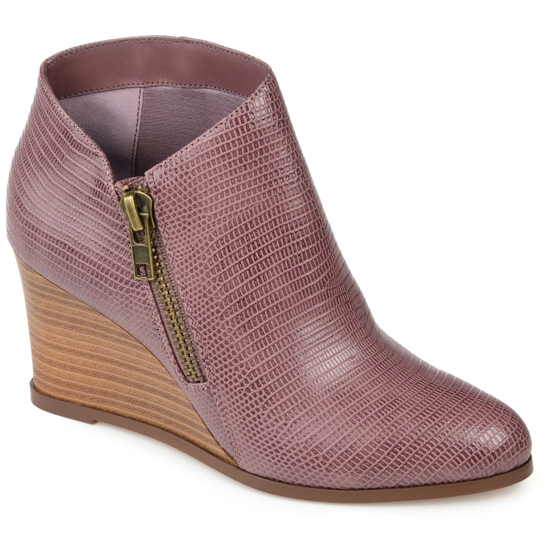 The Glam bootie adds a bold touch to any look with its snakeskin inspired texture. A low cut ankle with an exposed zipper elongates the legs and provides easy entry. This almond-toe vegan leather design by Journee Collection is finished with a stacked wedge heel lined with 4 mm Tru Comfort Foamβ’ footbed for a walkable lift.