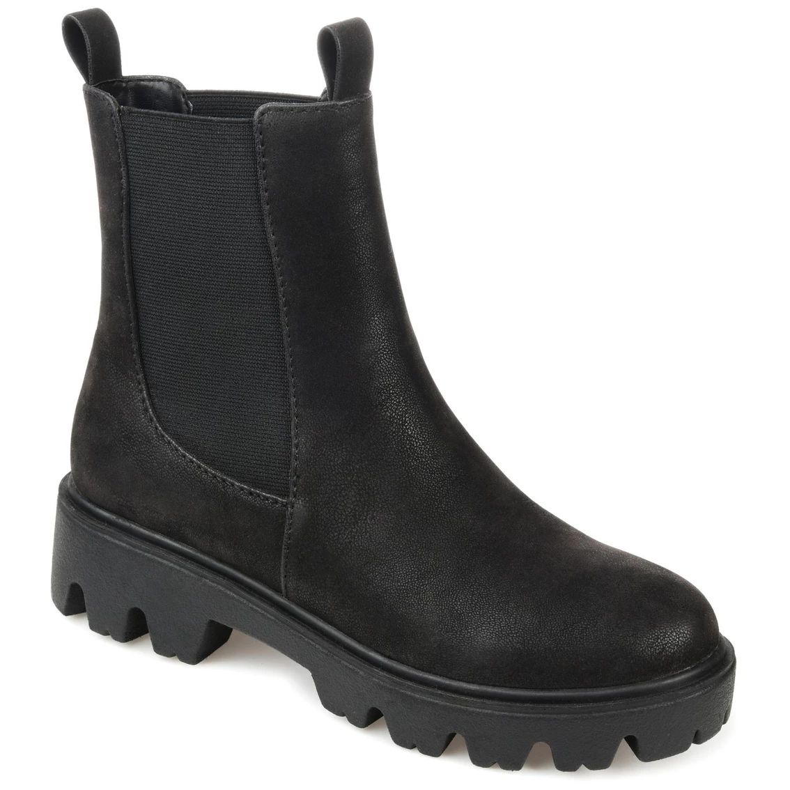 A 90s throwback that is sure to become a favorite, the Ivette by Journee Collection. This lug-soled chelsea bootie is topped with twin pull tabs and stretch gore panels on each side. A round-toe, vegan leather, and the softest 4 mm Tru Comfort Foamβ’ insole perfects this retro look.