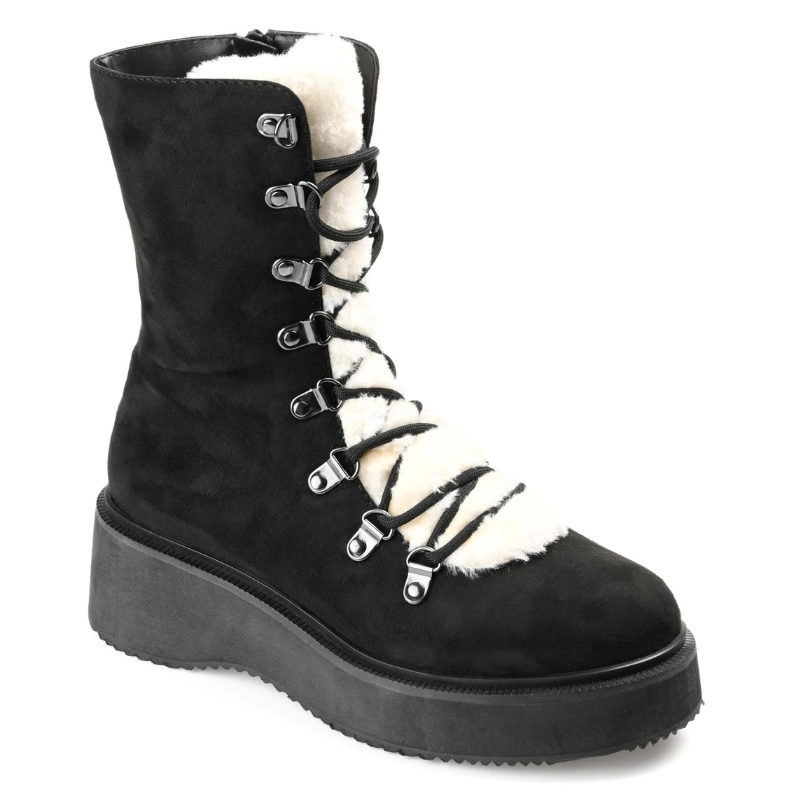 Cold weather booties with cool vibes, the Kannon by Journee Collection. This platform bootie is as functional as it is stylish with a 5 mm Tru Comfort Foamβ’ insole and warm faux fur accent. With soft vegan leather materials, metal eyelets, and a lace-up detail, you can boldly finish any outfit.