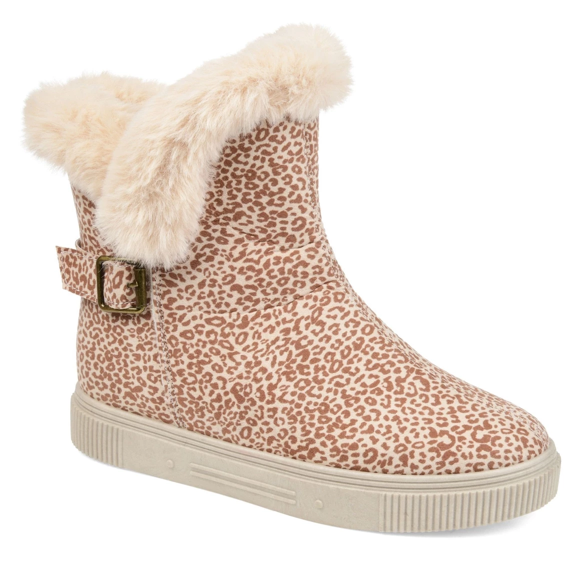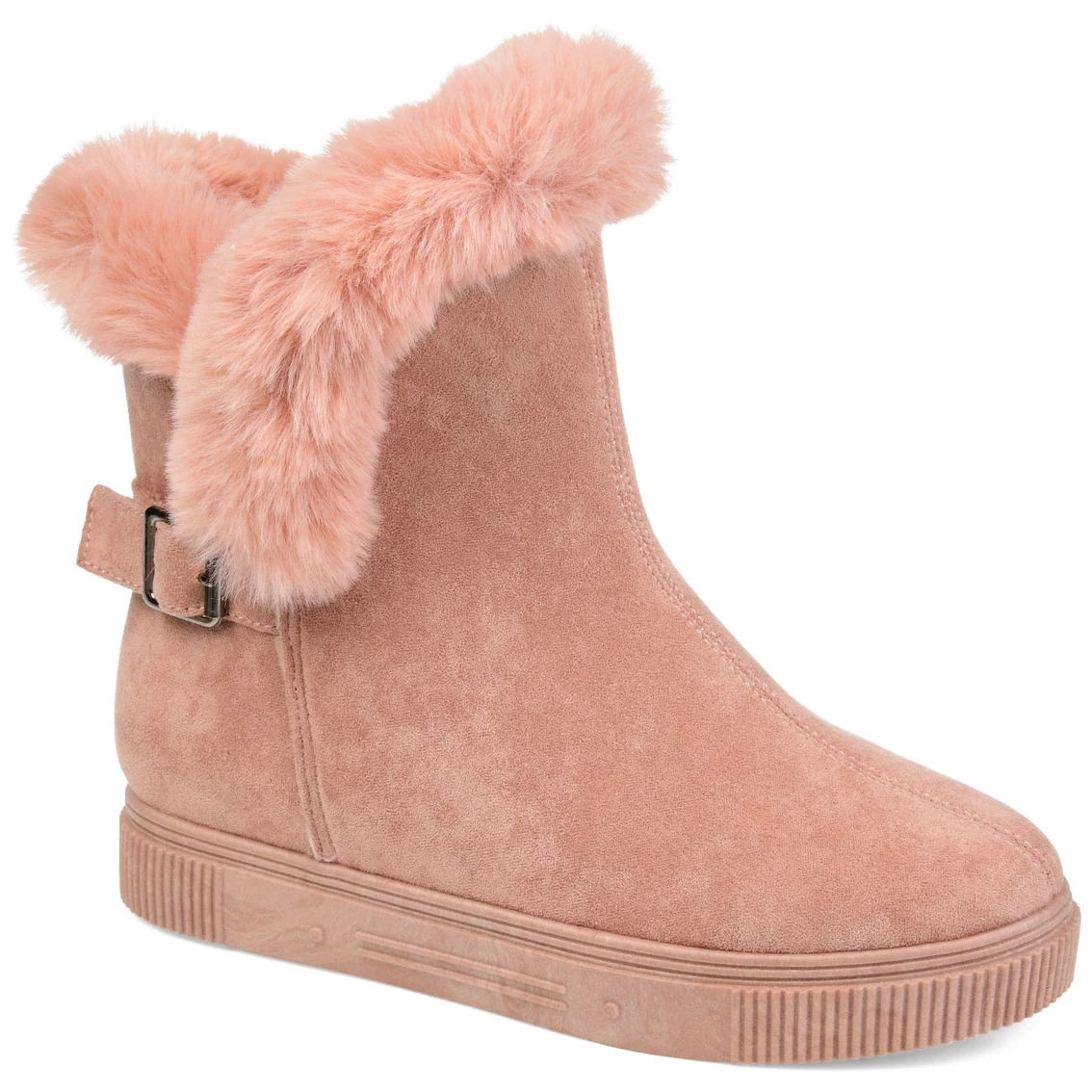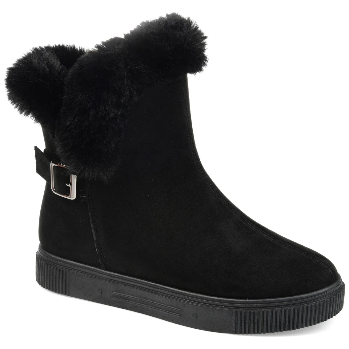 Step into your favorite new winter boot by Journee Collection. The Sibby boot features a soft round toe with fluffy faux fur trim. The platform rubber sole is perfect for those icy days, and the strap and buckle accents adds a little fun to your boot style.