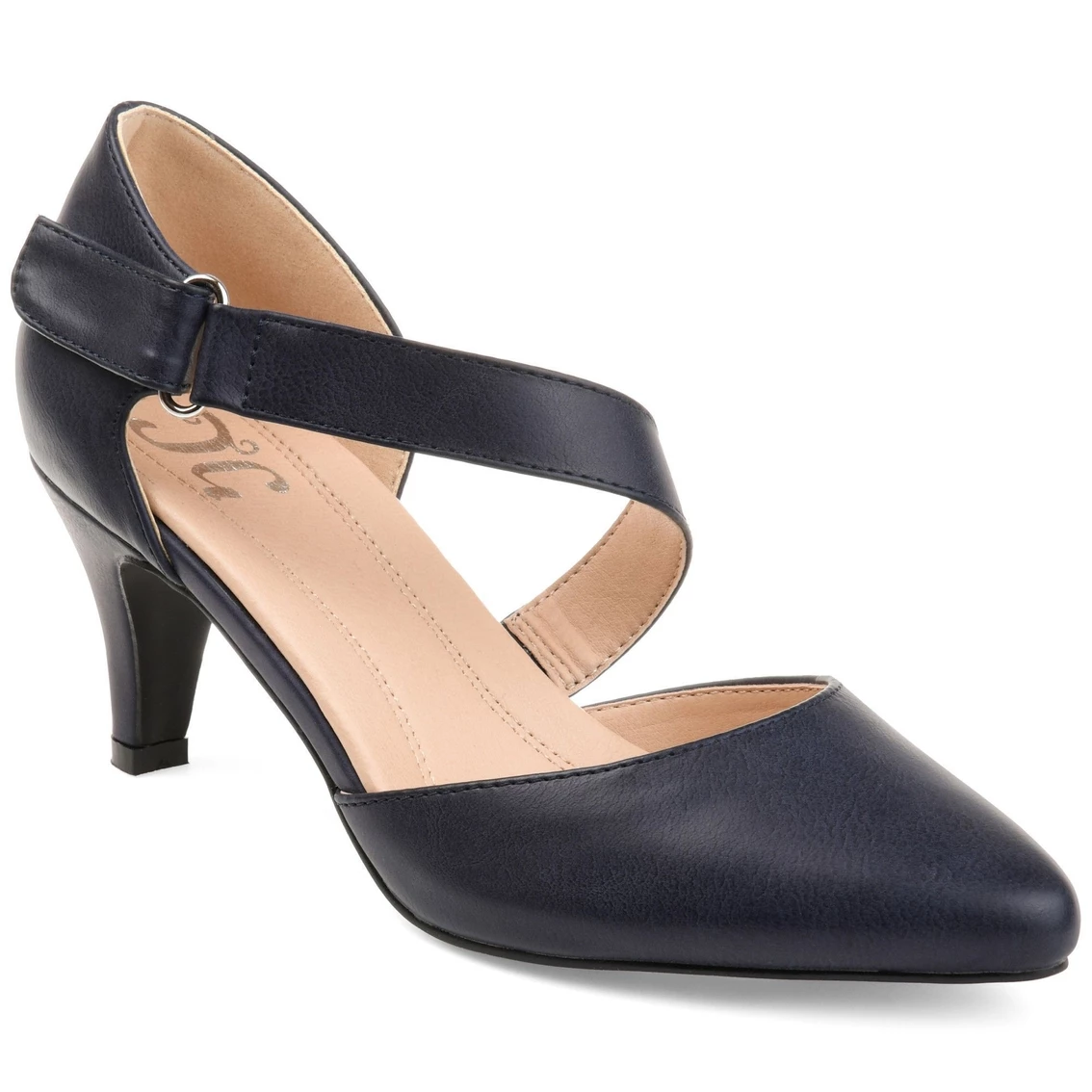 A crossover strap adds a modern touch to this classic silhouette. The Tillis by Journee Collection is a pointed-toe d’Orsay rendered with soft vegan leather and a 4 mm Tru Comfort Foamβ’ insole. The look is finished with a low heel, an adjustable belt-loop closure, and a wide-width footbed to make them easy on the feet.