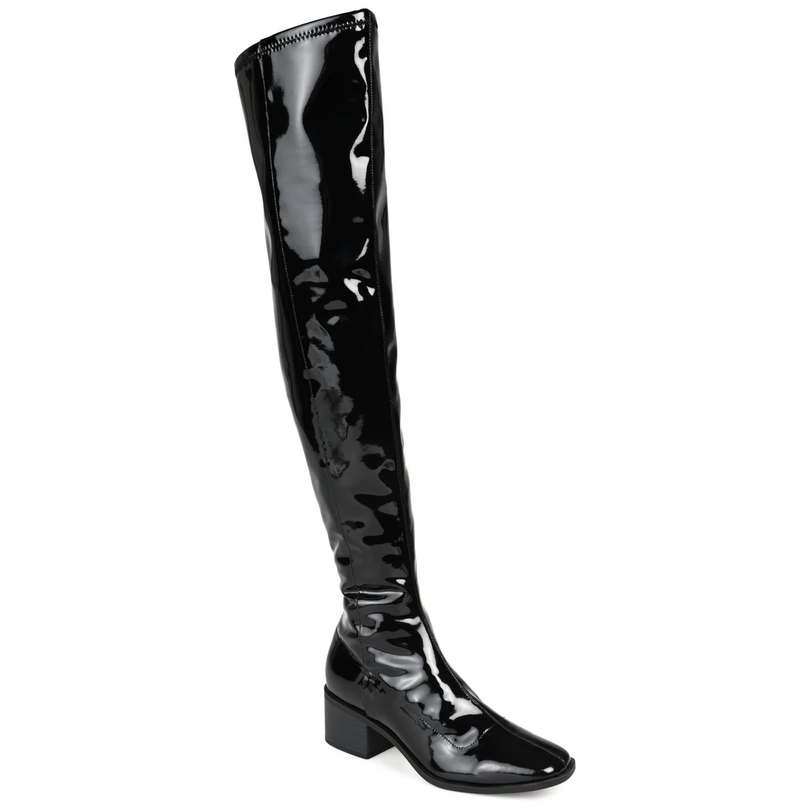 The definition of daring style, the Mariana thigh-high boot by Journee Collection. With a 4 mm Tru Comfort Foamβ’ footbed and stretchy vegan leather uppers, this wide-calf design offers comfort without compromising on style. A square-toe shapes the look, and a low block heel adds a subtle lift.