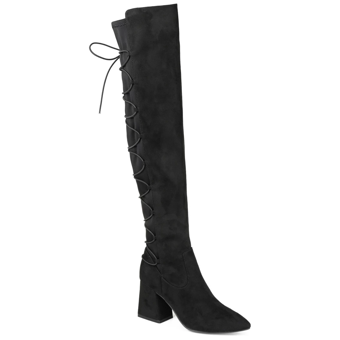 Versatile but never boring, introducing the Valorie boots by Journee Collection. This wide-calf boot features a pointed-toe, a 4 mm Tru Comfort Foamβ’ insole, and supple vegan leather detailed with a forgiving stretch gore panel. A chunky block heel and a back-lace design give this over-the-knee style a modern finish.