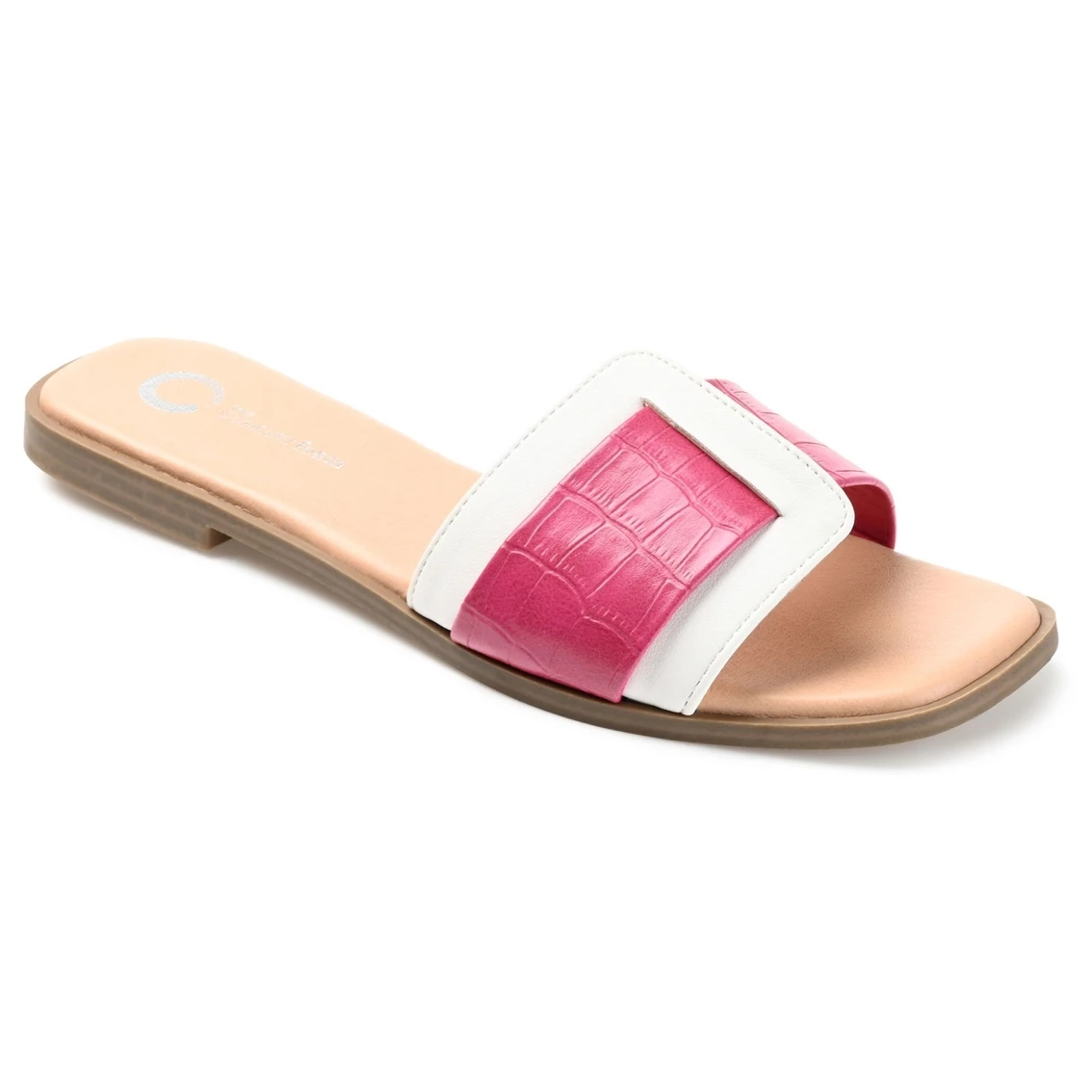The slide reinvented, the Victorya by Journee Collection. This slide-on sandal features a padded footbed for long-lasting support. Croc textured vegan leather and a two-tone detail top this bold look.