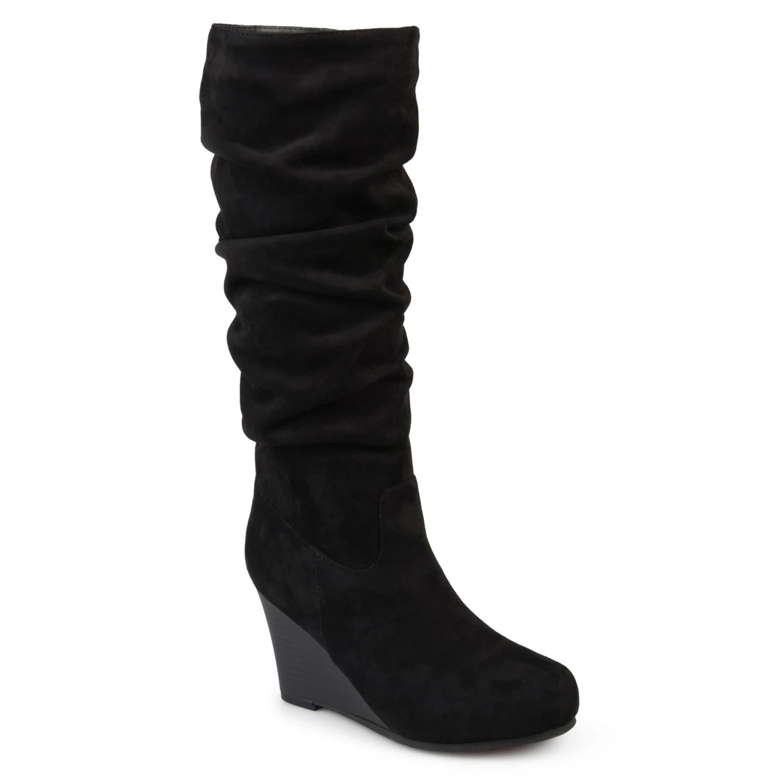 Show off stylish design in slouchy wedge boots by Journee Collection. These mid-calf boots are made with soft faux suede uppers with slouchy detail and an inside zipper. Stacked wedge heels provide attractive lift and round toes finish the style.