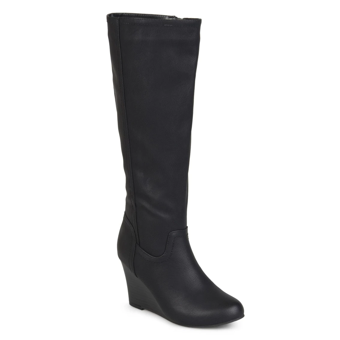 Show off classic design in wedge boots by Journee Collection. These fashionable boots are made with soft faux leather uppers that rise mid-calf and feature an inside zipper foot entry. Stacked wedge heels complete the style.