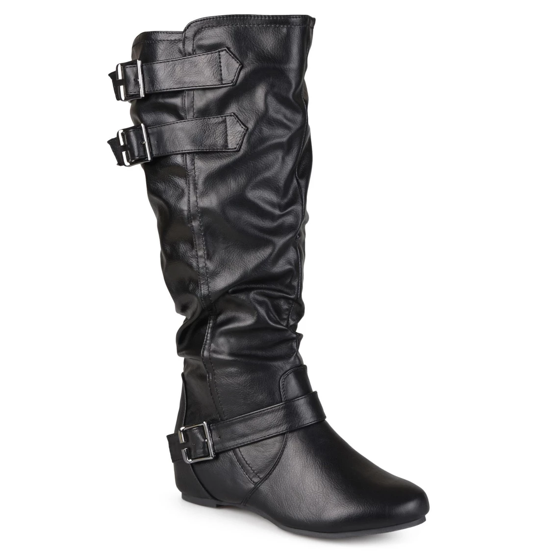 Express your style in chic flat boots by Journee Collection. These cute wide-calf boots feature faux leather uppers that rise mid-calf and highlight slouchy detail on the shafts for a relaxed look.