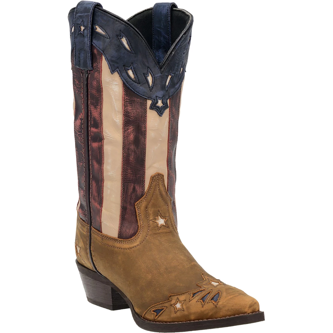 The Laredo Keyes boots are an all-American dream. Made with genuine distressed leather for a great look and showcases the classic red, white and blue colors of Old Glory herself. Touches of star-shaped underlays throughout. Also features a snip toe and cowboy heel. Style: 52165230.