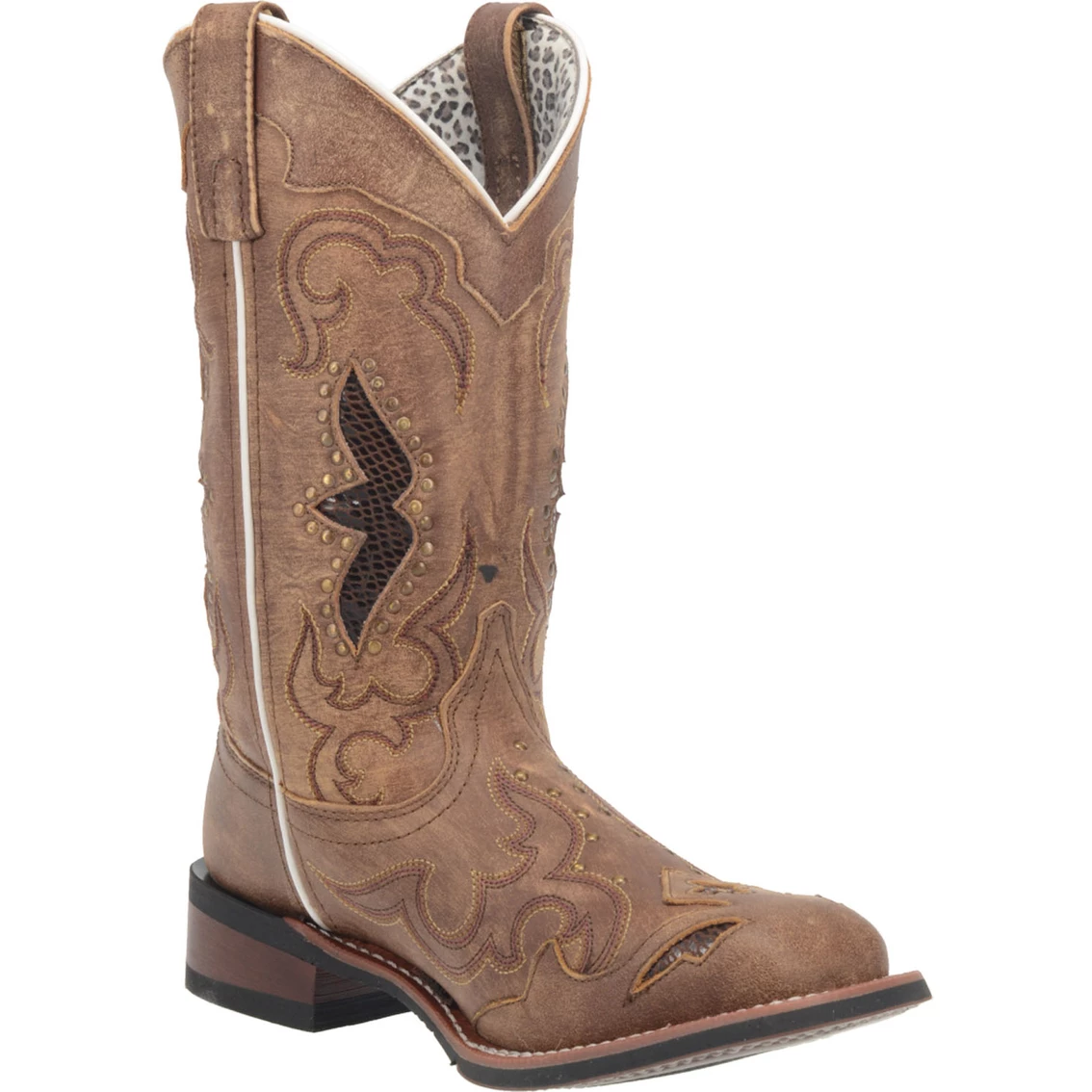 The Spellbound from Laredo is a wildly popular boot with gorgeous rustic appeal. Skillfully made with sanded goat leather. Showcases underlays with snake print and touches of brass accents and stitching throughout. Broad square toe, double stitched welt and a Cowboy Approved outsole.
