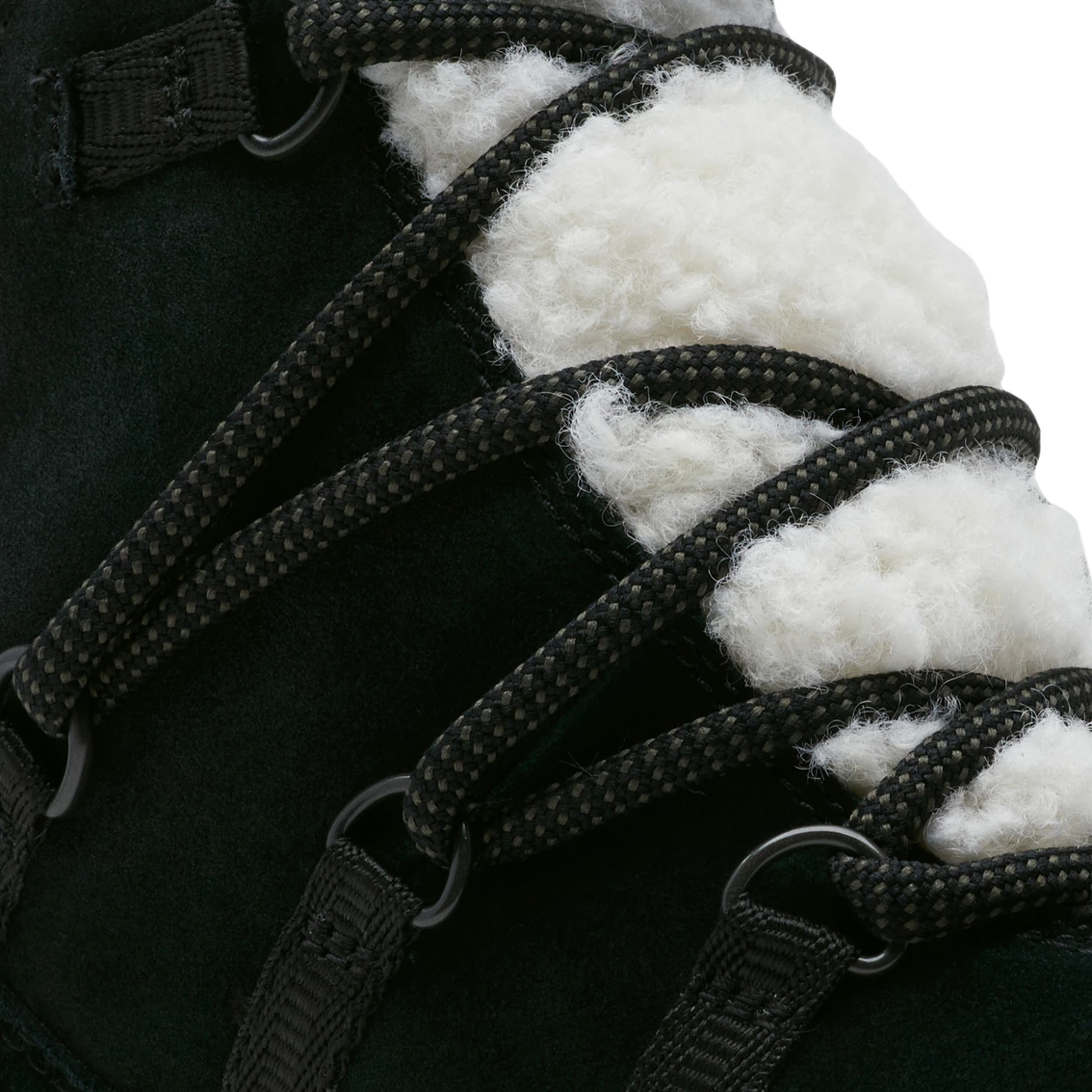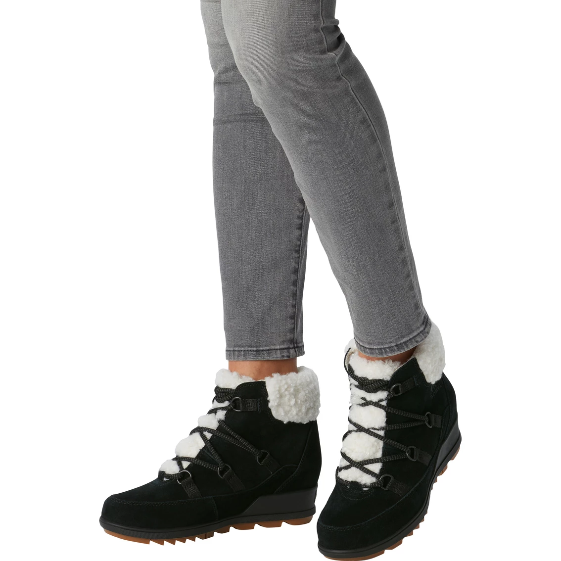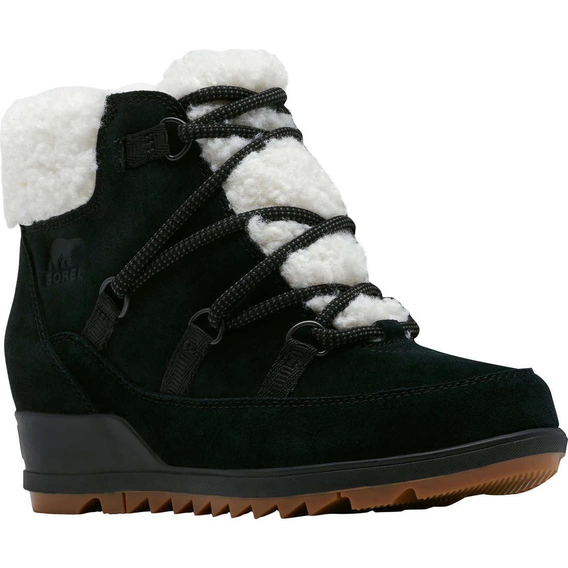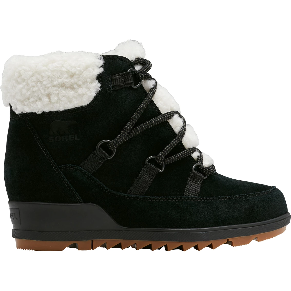 The Sorel Evie Cozy Lace Boots are a cozy wedge that holds its own in the cold. This suede style has a faux shearling collar and a microfleece lining to keep you toasty, plus waterproof materials that help seal out light rain. Itβs endlessly comfortable thanks to an EVA footbed and steadily grounded by a molded rubber sole. Style: 2038301.