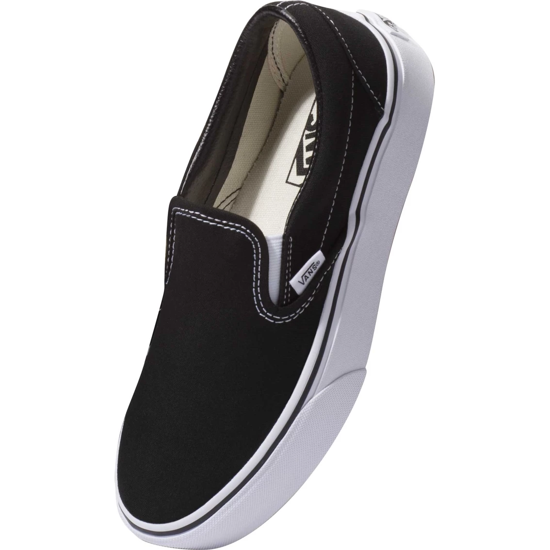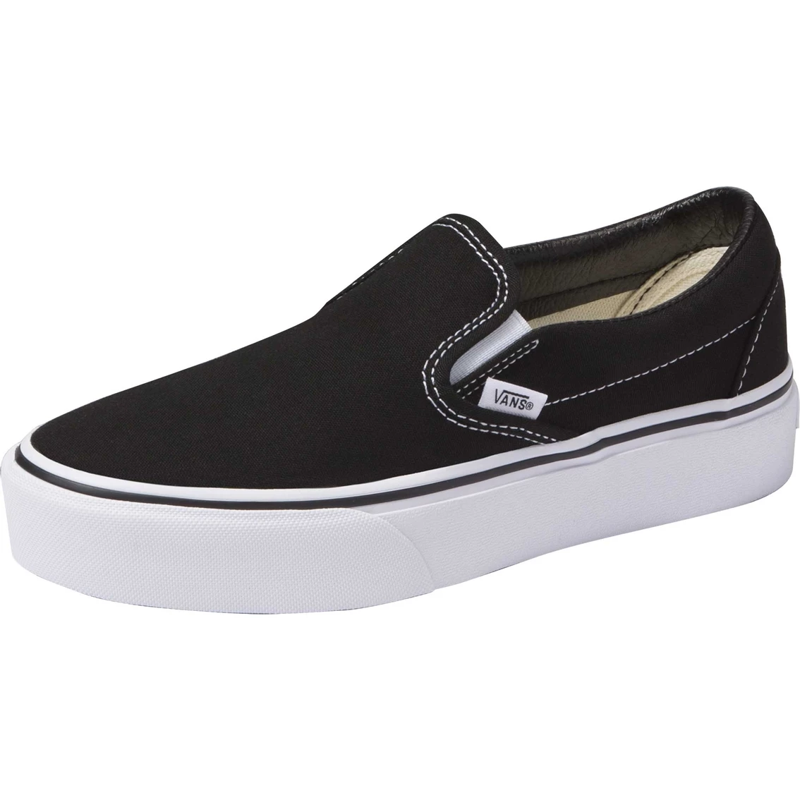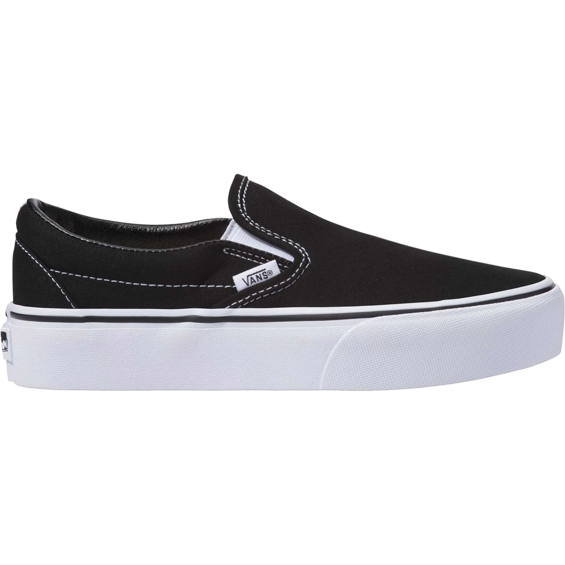 The Classic Slip-On Platform by Vans features sturdy low profile slip-on canvas uppers, padded collars, elastic side accents, and platform signature rubber waffle outsoles. Upgraded with a 25.4 mm platform height. Style: VN00018EBLK.